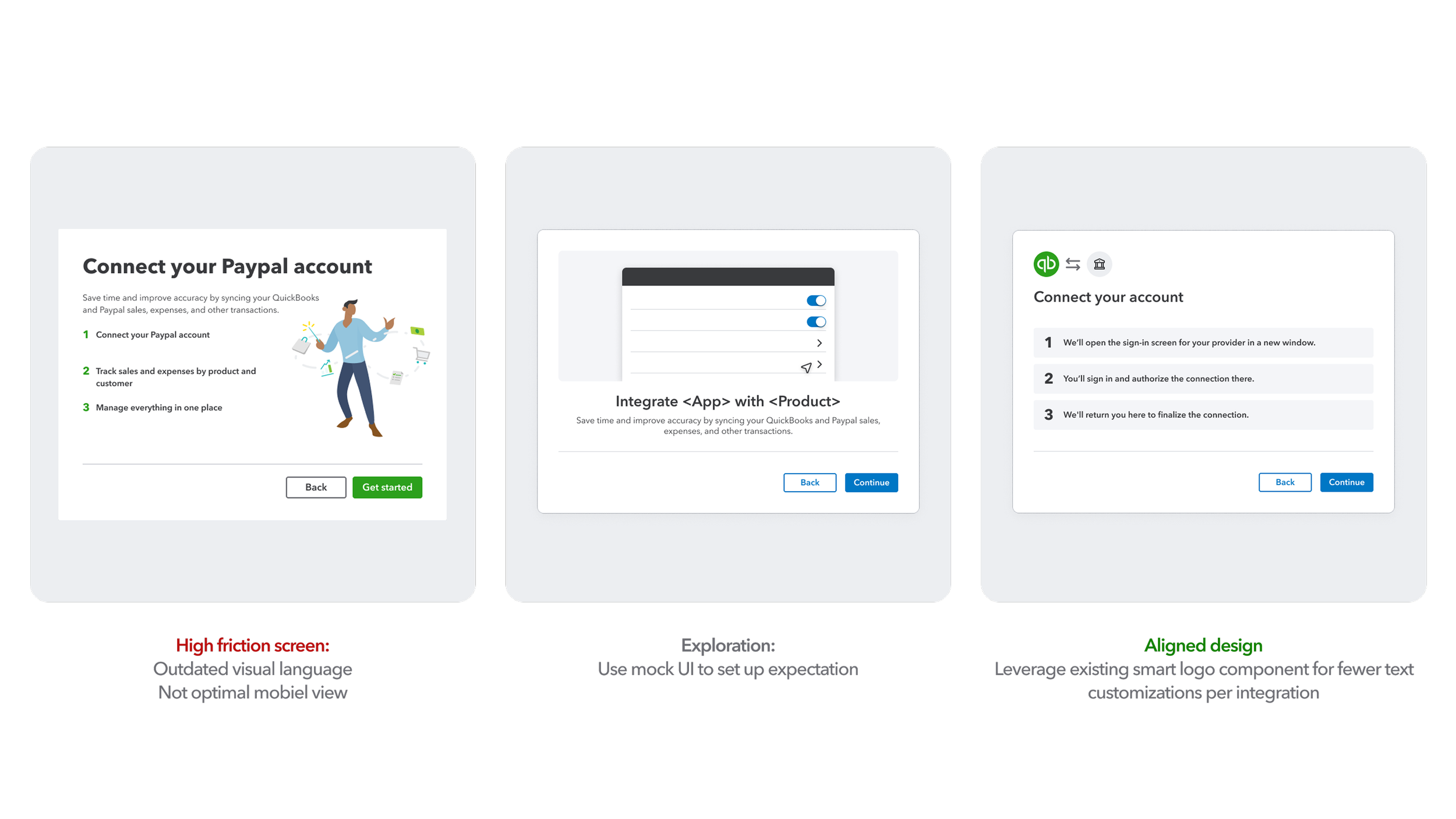 I streamlined and delivered a scalable user flow to integrate 3rd party apps into Intuit QuickBooks and Mailchimp, reducing user drop off, and accelerated development process per integration. This streamlined experience enables ~ 5 million Intuit customers to easily integrate 3rd party app all in one place, from payment processing, marketing, and leads generation.